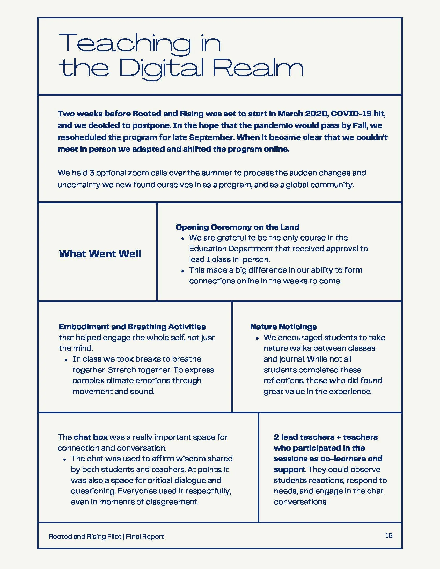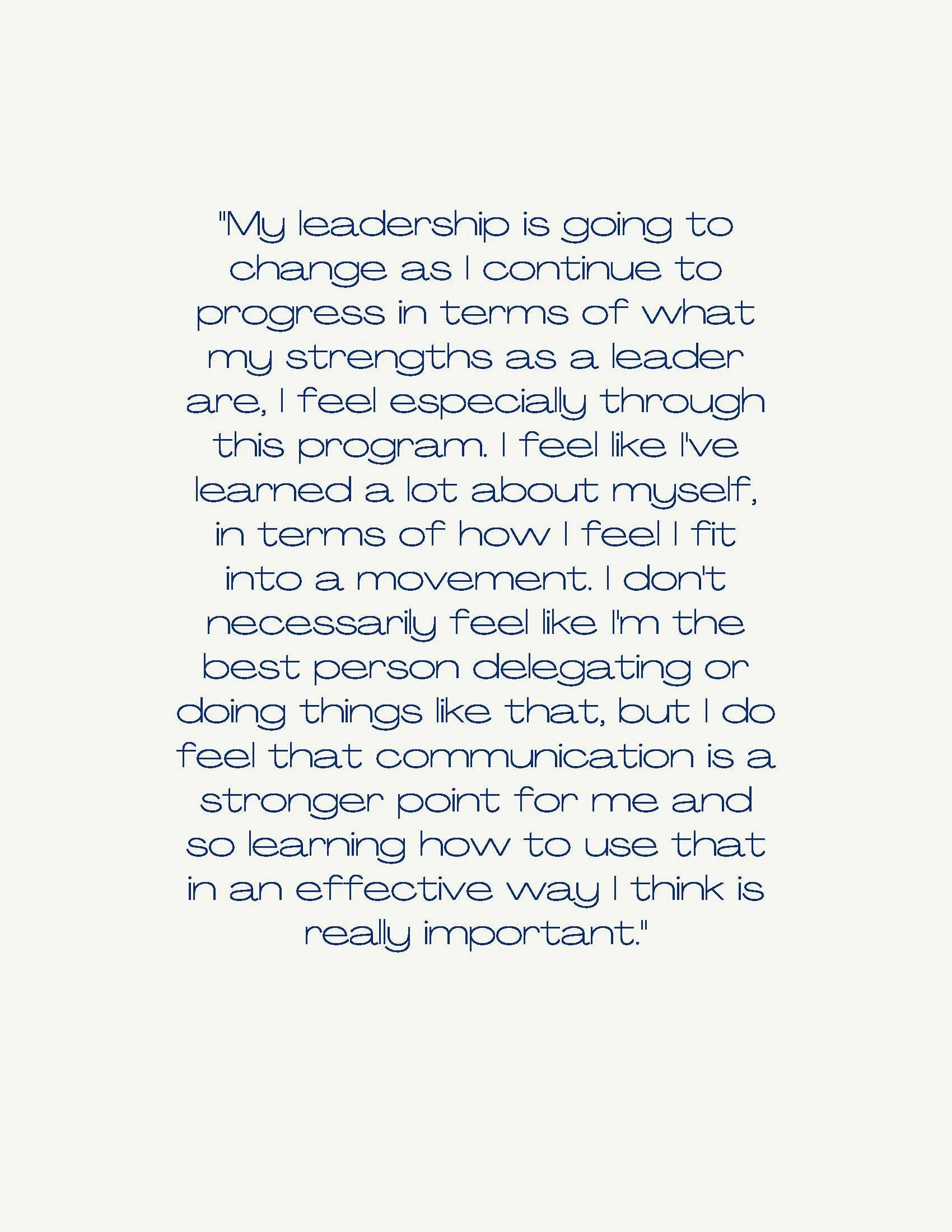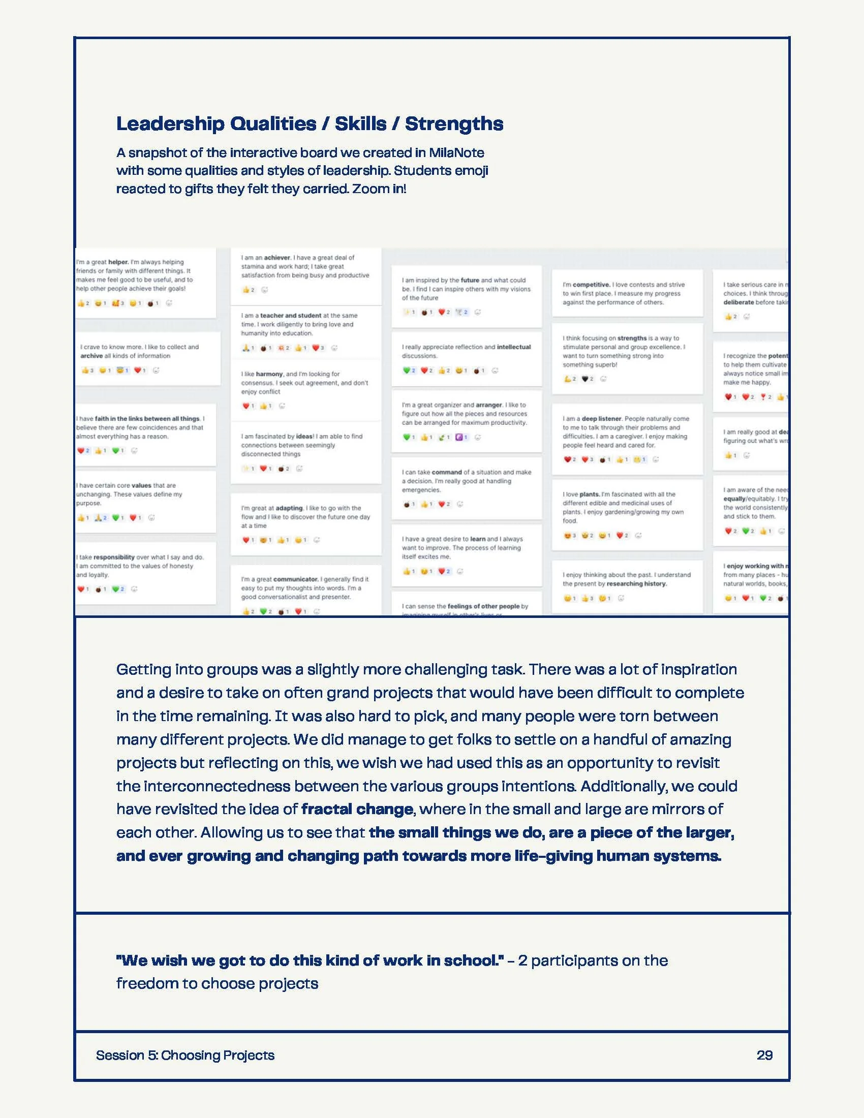 Students self-organized into projects, activating a project together in the final month of the program. Expanding into the many ways leadership is embodied, students were supported in identifying their personal strengths, gifts, and passions and develop projects from there.
