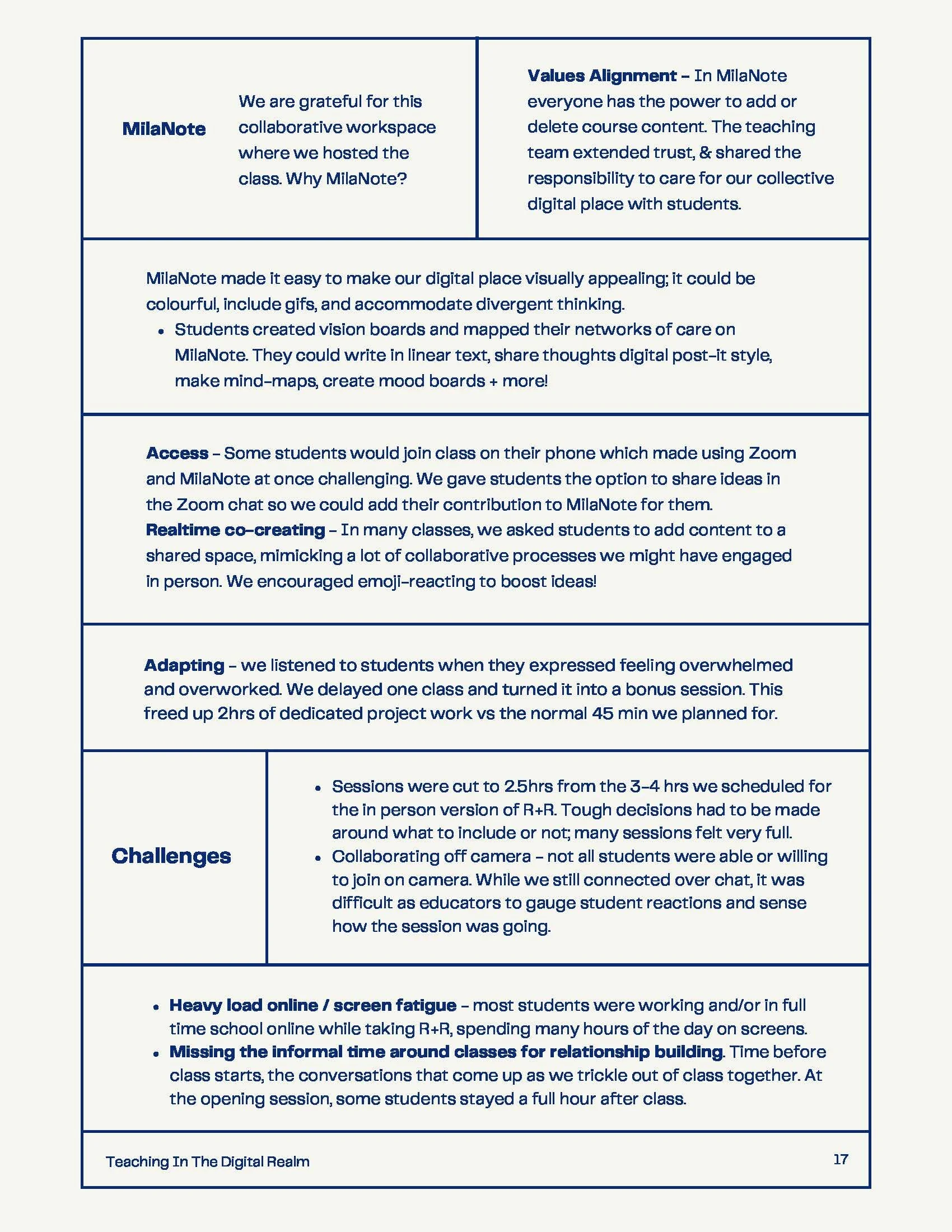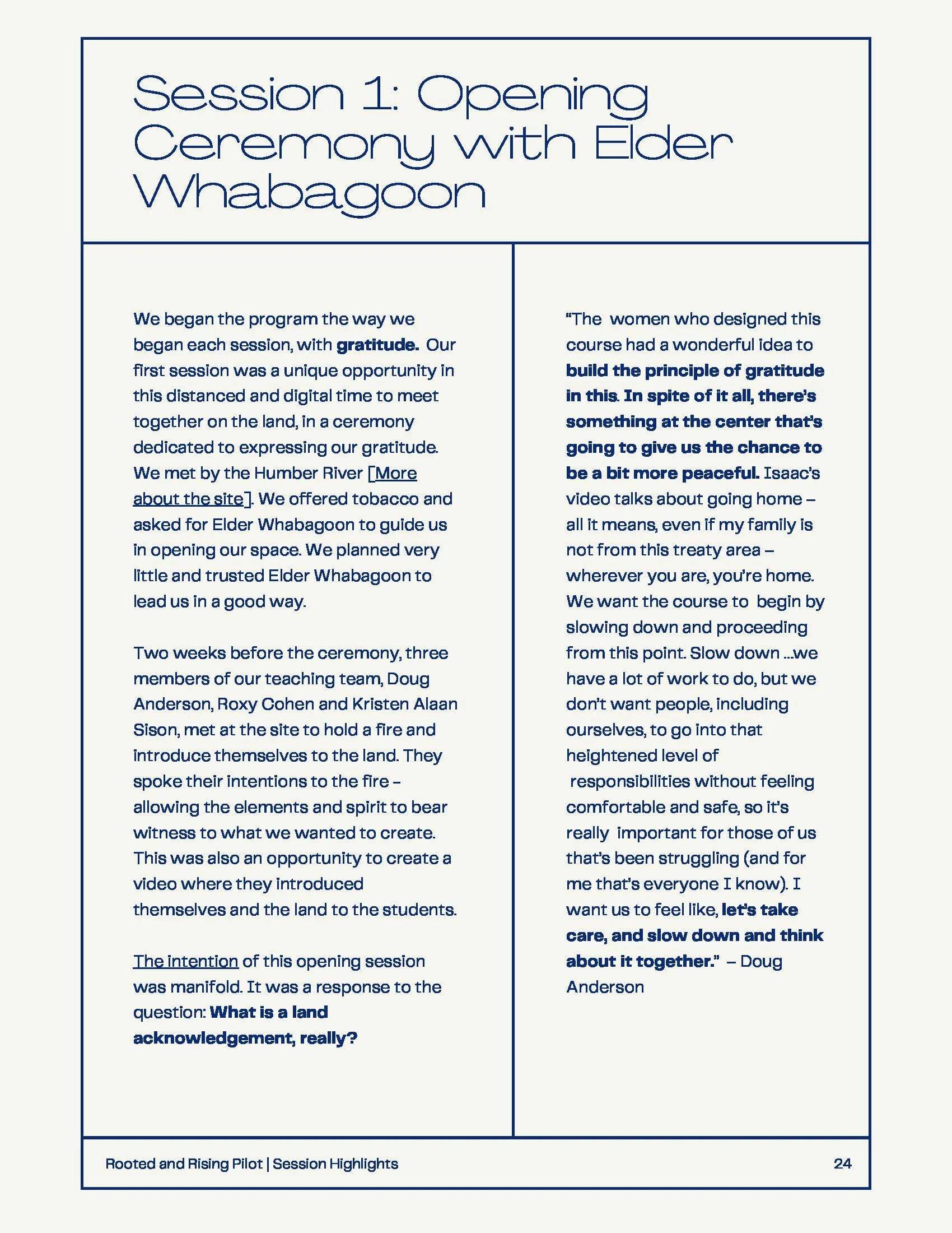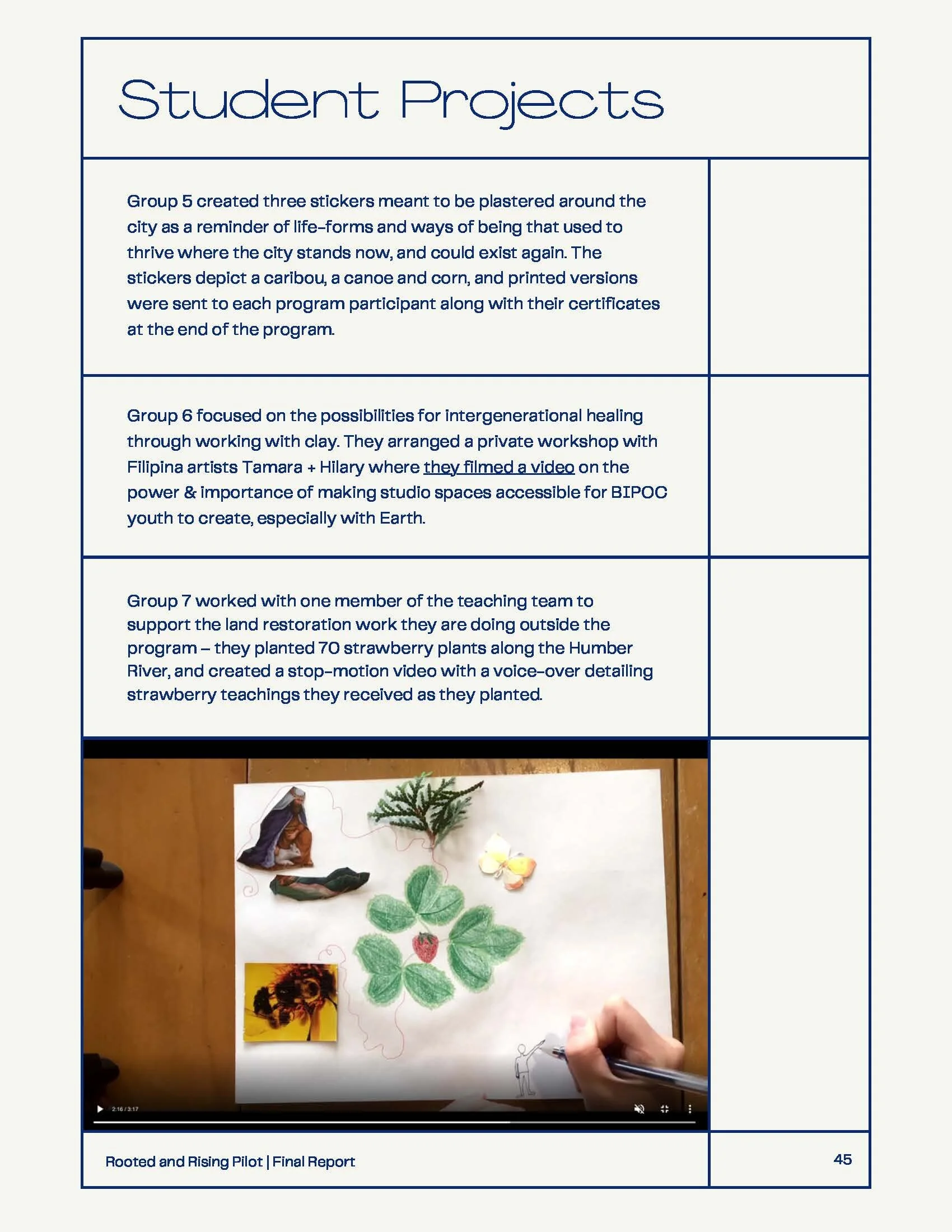 The range of projects were beautiful, with many connecting to the work of our partners: Group 1 took up Mike Schreiner’s invitation to policy work and developed arguments to push for a youth council on climate change at the provincial level, as agreed to in the 1992 Rio Declaration. Group 2, inspired by Yannick (DSF)’s sharing on systems thinking, started to develop a simple computer simulation that helps people see the systemic connections in food system issues. Group 3, made up of artists, aspiring teachers and Conscious Minds Collective (@conscious_minds) members, developed a children’s book on respecting water. Group 4 created a journalism series featuring youth climate activists who do and don’t identify as activists. Group 5 created three stickers with illustrations of corn, caribou, and a canoe, to be plastered around the city calling attention to the life-forms and ways of being that used to thrive where the city stands now and could exist again. Group 6 focused on intergenerational healing through clay work in a private workshop with Filipina artists Tamara + Hilary, creating a video on the power & importance of making studio spaces accessible for BIPOC youth to create with Earth for healing. Group 7 worked with one member of the teaching team in their land restoration work outside the program – they planted 70 strawberry plants along the Humber River, and created a stopmotion video with a voice-over detailing strawberry teachings they received as they planted.